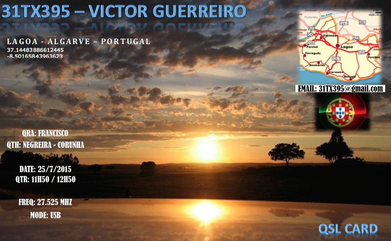 Dia 25/7/2015 foram realizados varios contactos e confirmados com diversas estações em especial em Espanha na banda dos 11m (27MHz):